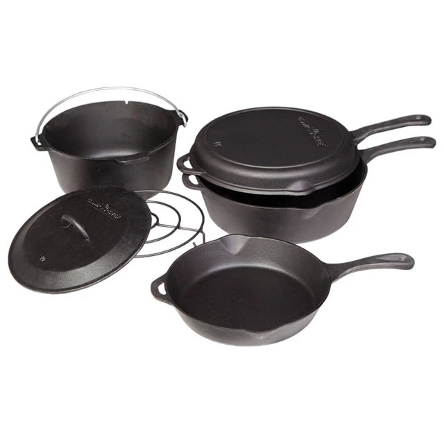 There’s no better way to start off your cast iron collection than with our 6-Piece Cast Iron Set. The kit includes a legless Dutch oven with a trivet, a 10-inch skillet, and a deep skillet with a matching lid that doubles as another skillet; you’ll have all the cast iron cookware you need for your favorite meals in the kitchen, at the campsite, or on the back patio. With our True Seasoned Finish, you can get cooking with your cast iron right away. Enjoy superior cast iron cooking today with the 6-Piece Cast Iron Set.
