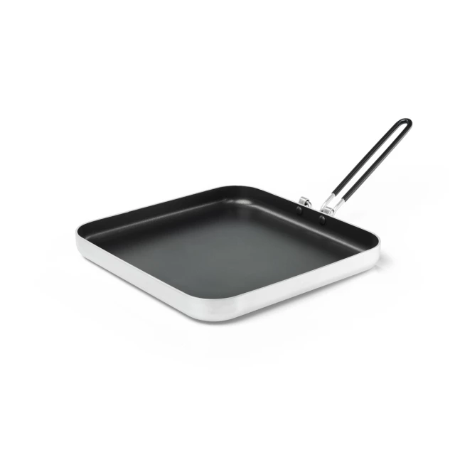 Designed for compact storage and maximum space utilization on propane camp stoves this Bugaboo series pan is constructed from high-quality aluminum which is both lightweight and even-heating to satisfy even the most demanding camp cook. On the outside, the highly-conductive aluminum exterior provides a beautiful, functional finish which belies its performance and value. On the inside, is a triple layer Teflon Classic, the legendary benchmark for non-stick surfaces and sets the bar for non-stick surfaces. All this combined with a SureLock folding handle makes for ideal family or group cooking. Bugaboo cookwares dependable, non-stick coating, even-heating surface and light weight epitomize value and versatility.