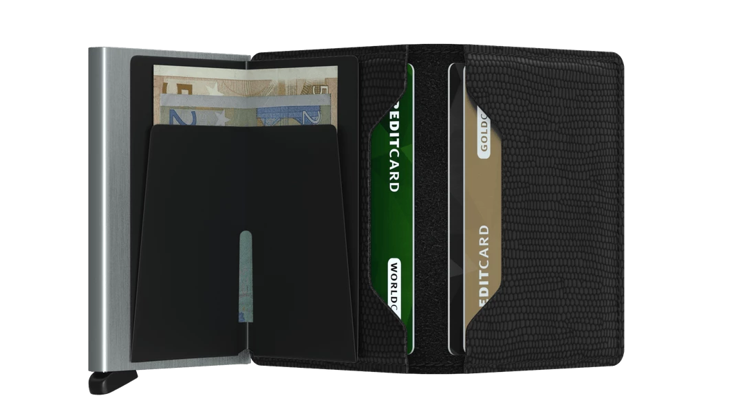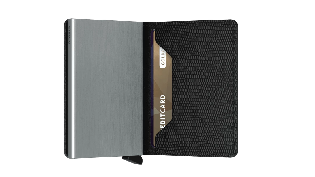 The Slimwallet is a modern take on the classic billfold. With its slim profile it fits perfectly into every pocket. The generously cut leather holds at least an additional six cards, banknotes and business cards. The patented mechanism allows you to slide out your cards with one simple motion, ready for immediate use. The aluminium protects from bending, breaking and unwanted wireless communication. Rango has a deep duotone colour and a fine lizard embossing that makes it striking in subtle ways. A leather type that stands the test of time.