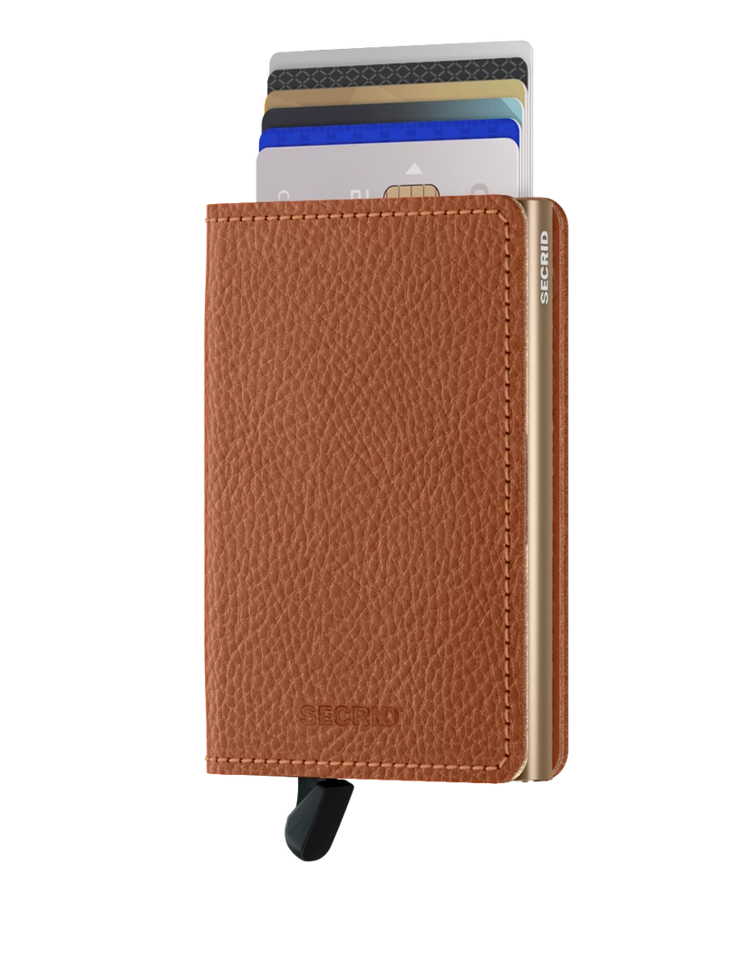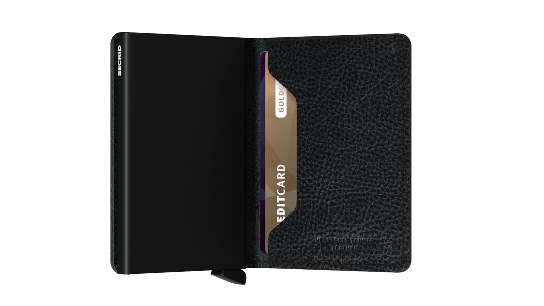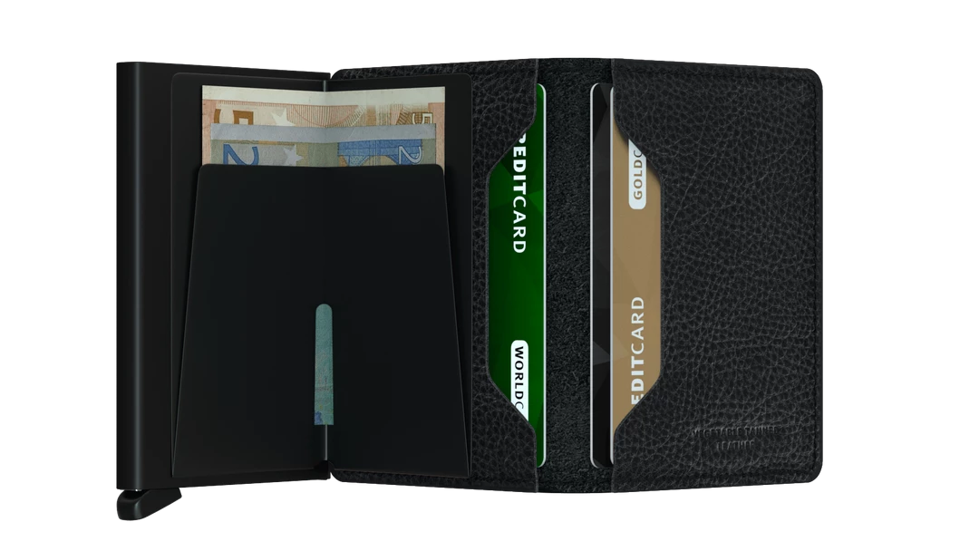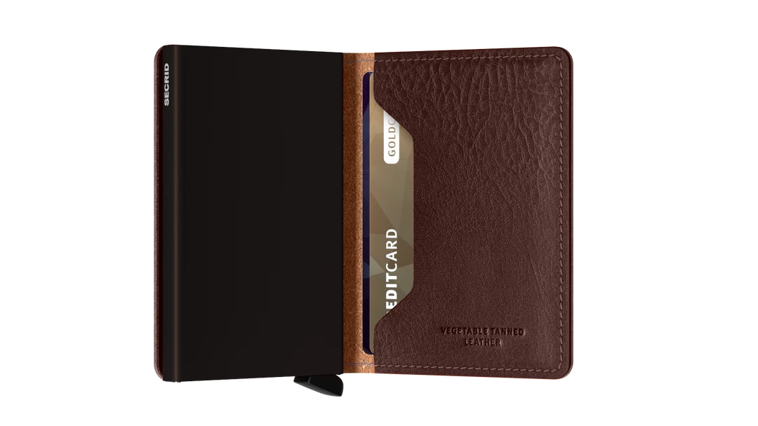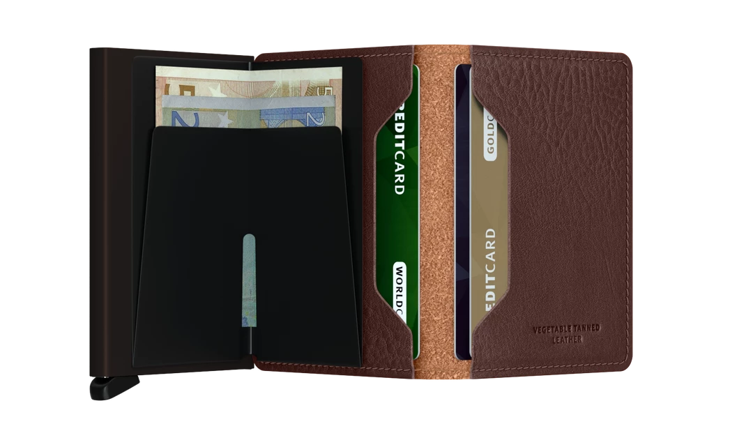 The Slimwallet is a modern take on the classic billfold. With its slim profile it fits perfectly into every pocket. The generously cut leather holds at least an additional six cards, banknotes and business cards. The patented mechanism allows you to slide out your cards with one simple motion, ready for immediate use. The aluminium protects from bending, breaking and unwanted wireless communication. Using only natural materials, an Italian family tannery employs the traditional process of vegetable tanning to make this distinctive leather age beautifully.