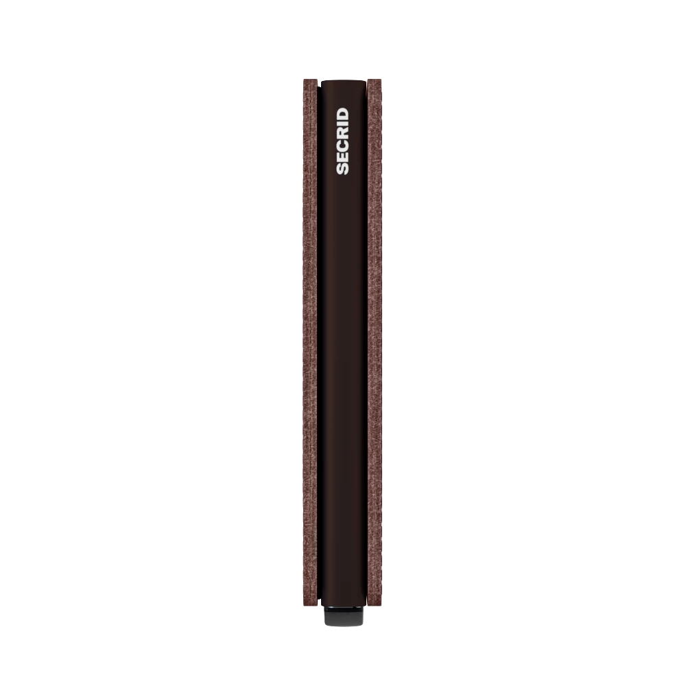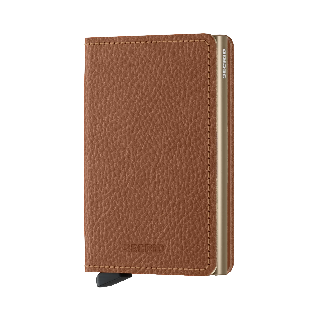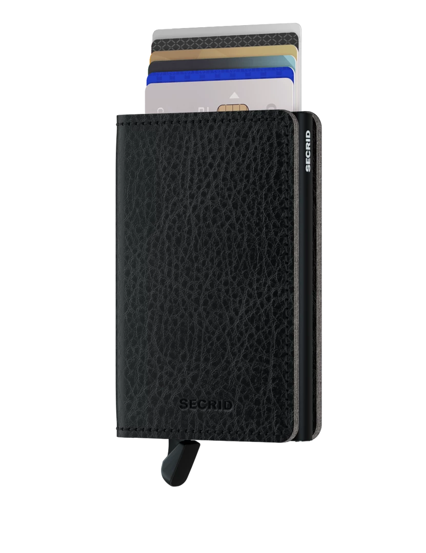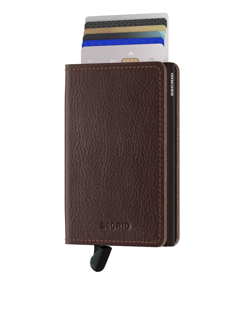 The Slimwallet is a modern take on the classic billfold. With its slim profile it fits perfectly into every pocket. The generously cut leather holds at least an additional six cards, banknotes and business cards. The patented mechanism allows you to slide out your cards with one simple motion, ready for immediate use. The aluminium protects from bending, breaking and unwanted wireless communication. Using only natural materials, an Italian family tannery employs the traditional process of vegetable tanning to make this distinctive leather age beautifully.