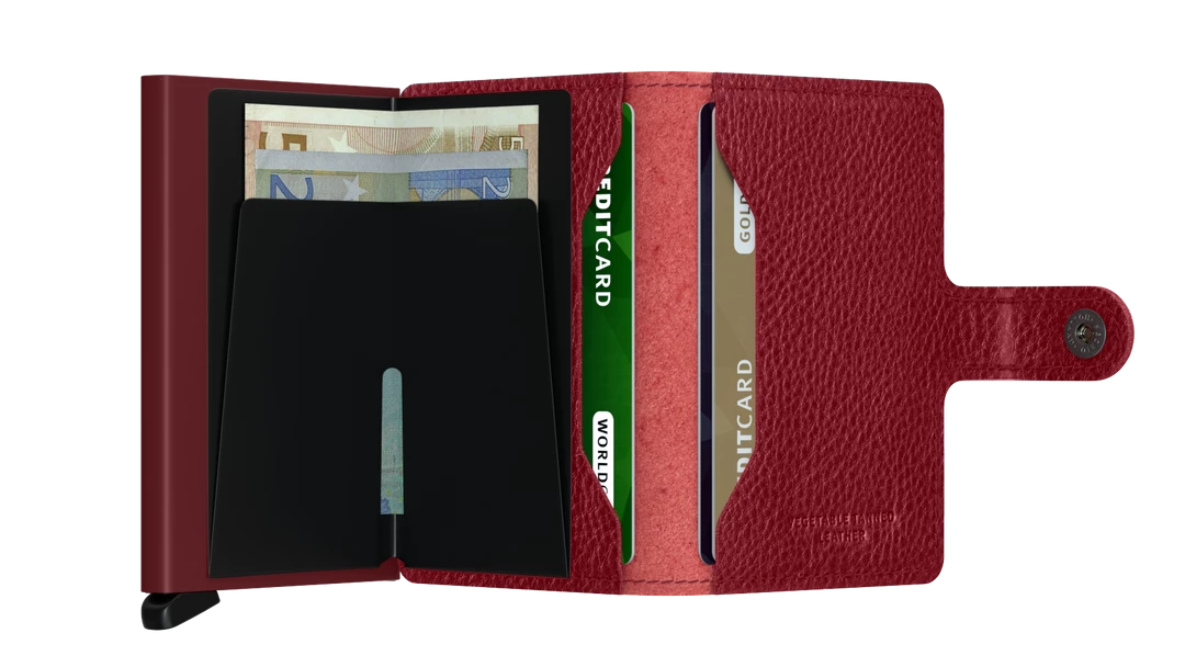 Our most iconic wallet and the perfect all-rounder. The Miniwallet is compact in size and surprisingly large in storage capacity. With a wide variety of styles and colours, it fits every pocket. The patented mechanism allows you to slide out your cards with one simple motion, ready for immediate use. The aluminium protects from bending, breaking and unwanted wireless communication. Using only natural materials, an Italian family tannery employs the traditional process of vegetable tanning to make this distinctive leather age beautifully.