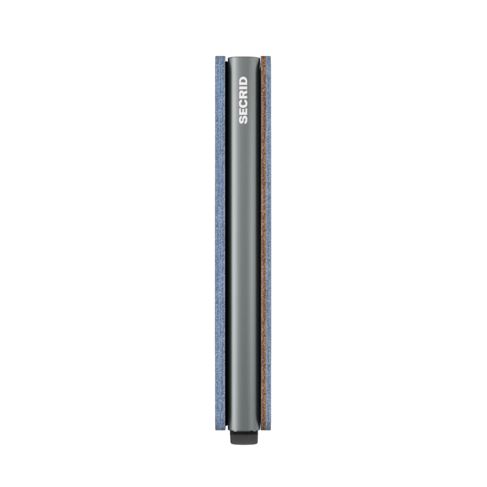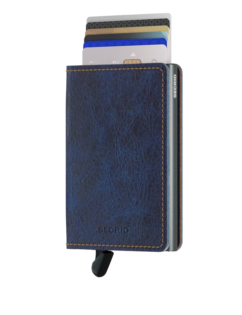 The Slimwallet is a modern take on the classic billfold. With its slim profile it fits perfectly into every pocket. The generously cut leather holds at least an additional six cards, banknotes and business cards. The patented mechanism allows you to slide out your cards with one simple motion, ready for immediate use. The aluminium protects from bending, breaking and unwanted wireless communication. Slimwallet Indigo 5-Titanium is inspired by the unique colouring of denim. The soft leather is dipped repeatedly to a perfect shade of multitoned denim blue.