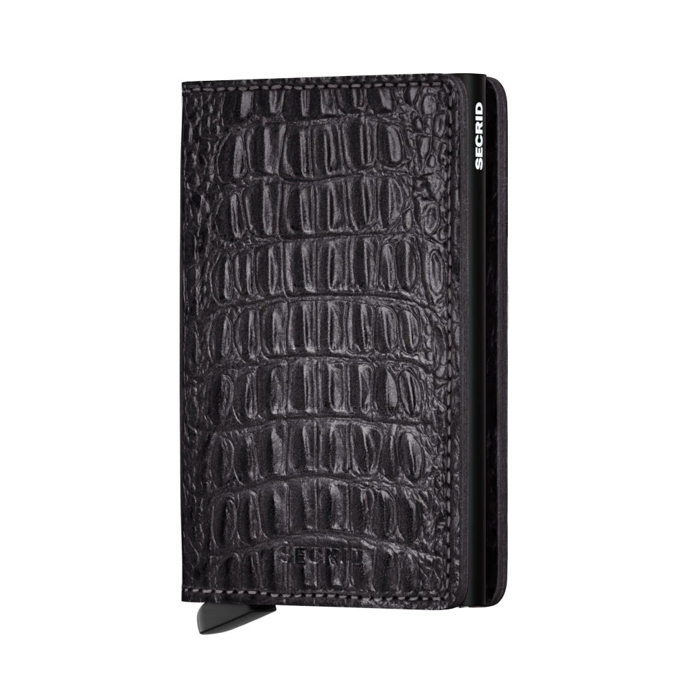The Slimwallet is a modern take on the classic billfold. With its slim profile it fits perfectly into every pocket. The generously cut leather holds at least an additional six cards, banknotes and business cards. The patented mechanism allows you to slide out your cards with one simple motion, ready for immediate use. The aluminium protects from bending, breaking and unwanted wireless communication. The Slimwallet Nile has a handmade crocodile texture which is achieved by the special tamponato technique, finished with a high gloss.